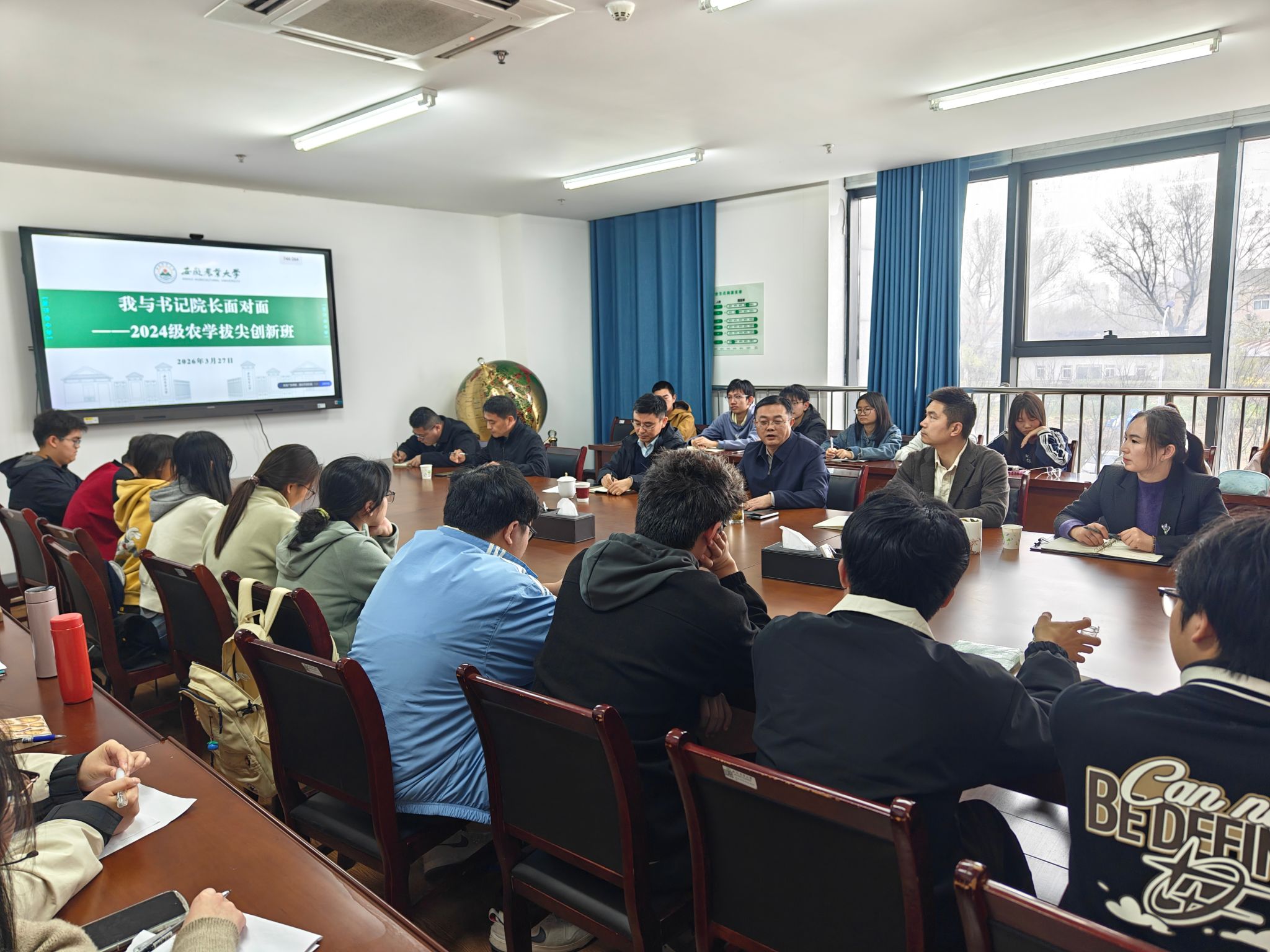 本网讯 为精准助力学生明确成长方向,科学规划学业与职业发展,切实回应学生学习生活中的实际困惑,3月27日上午,农学院在朝阳楼206召开“我与书记院长面对面”座谈会。学院党委书记王涛,党委副书记、院长王晓波,副院长卢杰、余恩,院长助理田礼欣等出席会议,2024级农学拔尖创新班全体同学参加座谈,会议由辅导员彭琼琼主持。