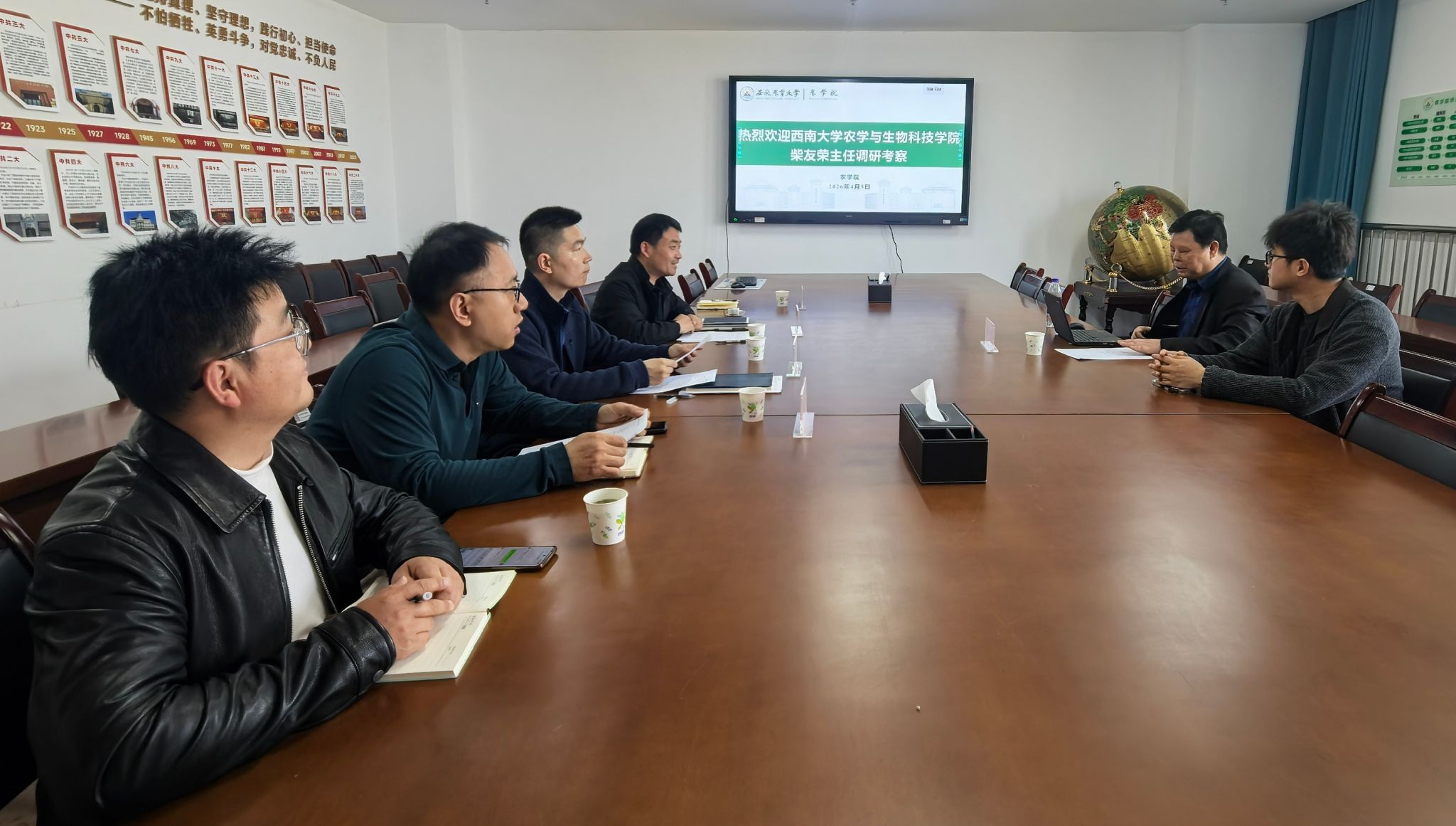 本网讯 4月5日下午,西南大学农学与生物科技学院生物育种科学专业负责人柴友荣教授一行到访我院,开展专业建设调研交流。副院长卢杰、副院长余恩,作物遗传育种系主任黎珉,学院教学(科研)助理田礼欣、张付贵参加座谈会。卢杰主持座谈会。