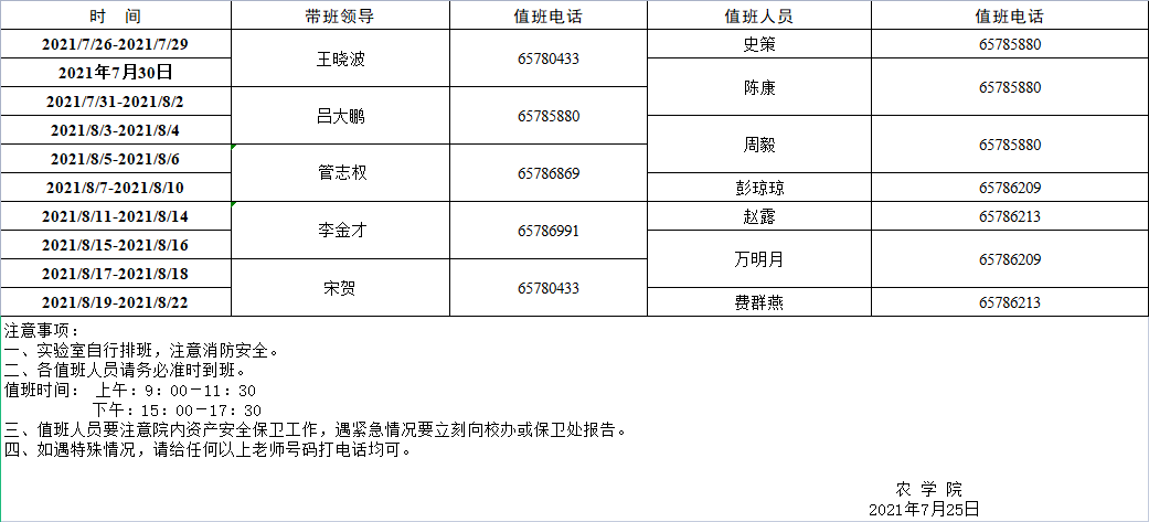 农学院2021年暑期值班安排表
