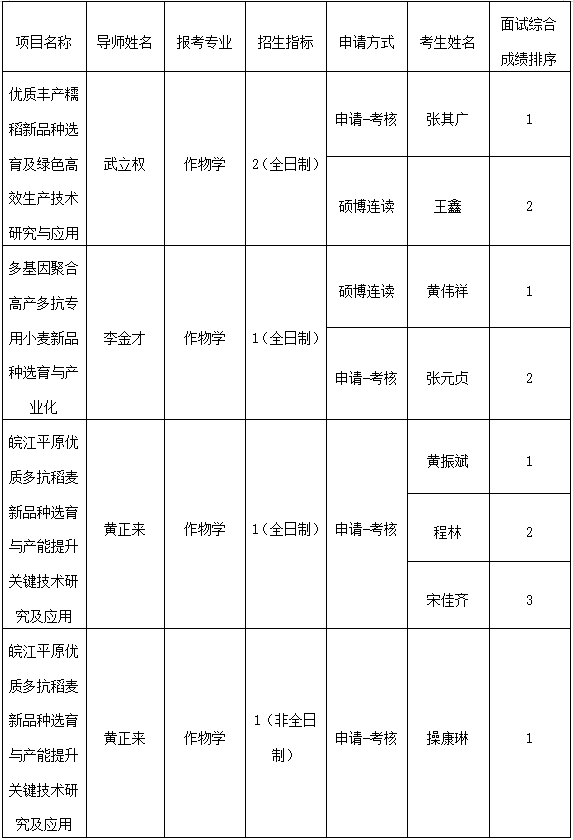 根据《关于做好2025年教育部高等研究院校企联合人才培养和科研攻关项目研究生招生计划管理工作的通知》(教发司〔2025〕20号)和《关于做好2025年教育部安徽高等研究院校企联合人才培养和科研攻关项目计划招生的通知》(皖教秘科〔2025〕29号),现公示农学院2025年教育部安徽高等研究院校企联合人才培养和科研攻关项目博士生招生“硕博连读”和“申请-考核”考生面试成绩排名如下: