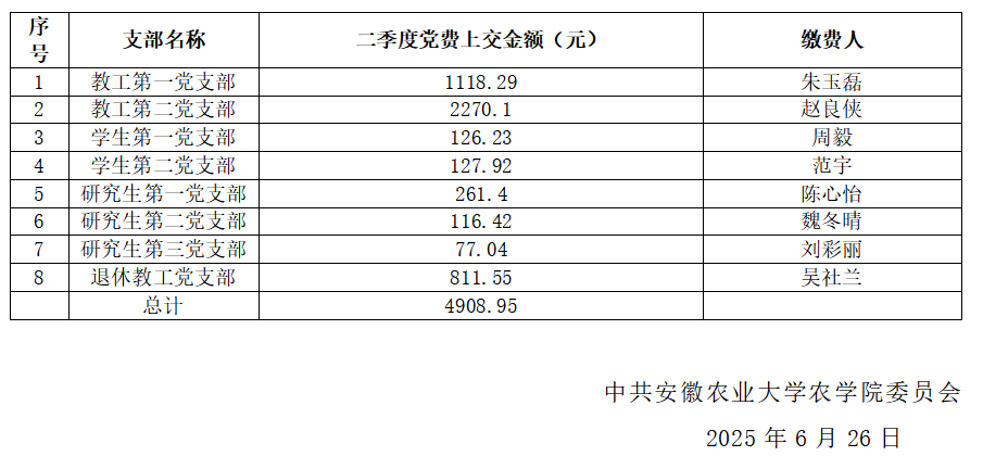农学院2025年第二季度党费收缴公示