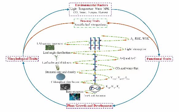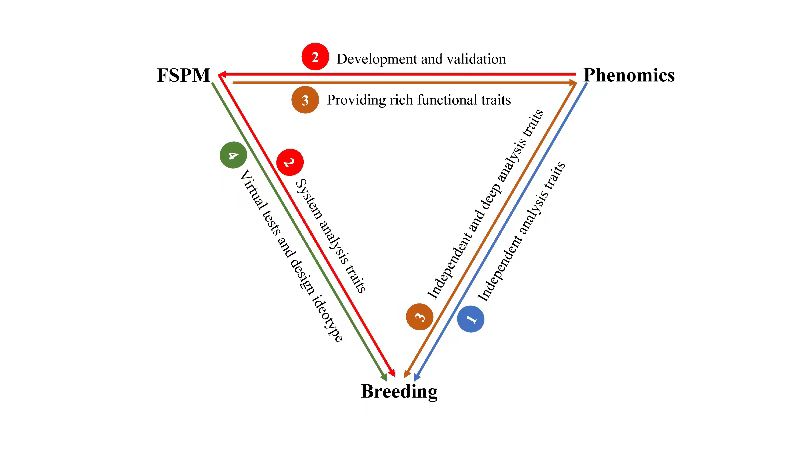 在高产或恶劣环境下,植物内在功能性状鉴定和表型分析严重制约育种进程。植物功能结构模型(Functional-Structural Plant Modelling, FSPM)是在器官水平对植物结构与功能互反馈过程的建模与仿真,能够预测从微观尺度(基因、细胞)到宏观尺度(个体、群体)的作物系统行为,促进了对跨尺度复杂性状的理解。在建模过程中,FSPM可以展示更详细的植物功能属性变化及调控机制,如Rubisco羧化率、叶肉电导、比叶氮、辐射利用效率、源汇比等,从而提供更多的次级性状来揭示分子调控机理。因此,FSPM是指导不同尺度功能性状表型的宝贵工具,为作物改良的表型分析提供丰富的功能靶点。