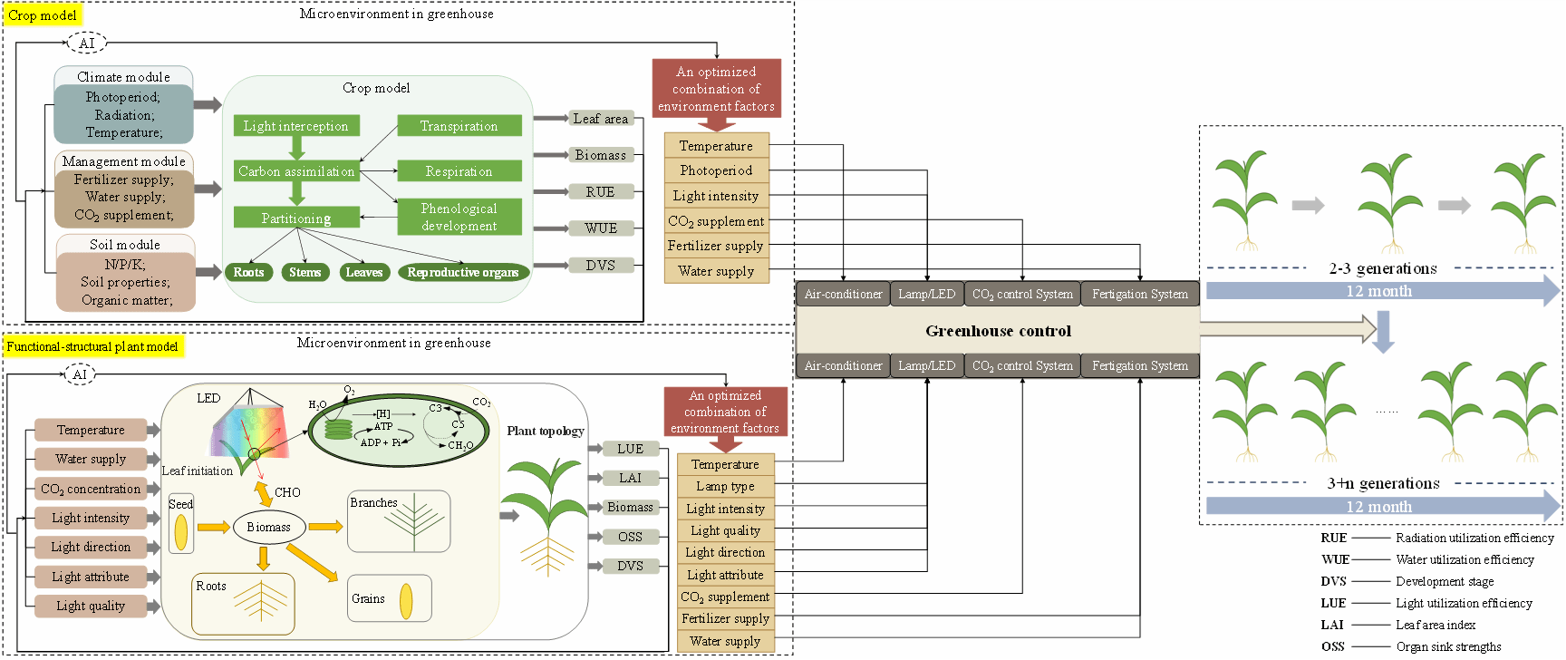 “快速育种”(Speed breeding)是一种主要通过在受控环境中调节光照和温度来加速作物世代的技术。一定程度上,定制快速育种实施的环境条件依赖于个人的经验,因此可以进一步优化。作物和植物模型已被开发为预测广泛作物物种在各种环境下生长和发育的强大工具。为了优化速度育种,作物模型可以通过群体水平的管理来预测由基因型和环境引起的表型,而植物模型可以通过器官水平的微环境来检查三维植物结构动态。通过在测试环境x基因型x管理中使用模型执行大量模拟试验,快速确定实现所需植物表型的环境因素的优化组合。文章表明作物和植物模型是一种很有前景的工具,可以实现‘加速育种’预测环境因素的优化组合,进一步缩短作物育种时间。