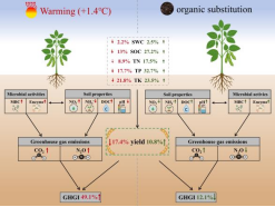 全球变暖对农田生态系统稳定性和粮食安全造成了严重威胁。然而,目前增温和肥料施用类型对温室气体排放和大豆产量的交互影响及其微生物机制仍不清楚。该研究通过红外辐射增温设备模拟气候变暖,设置增温(环境温度vs.增温1.4℃)与施肥制度(单施化肥vs. 60%有机肥替代)双因素随机区组试验。结果表明,增温刺激了微生物和碳、氮、磷循环酶活性,加速有机质矿化和养分周转,造成土壤有机碳和全氮下降而可溶解有机碳和NO3-上升,最终显著增加大豆季CO2和N2O累计排放。有机肥替代显著提高CO2累计排放,这主要是由于高粪肥碳输入以及微生物和酶活性受刺激。相比之下,有机肥替代缓冲土壤 pH,增加碳可利用性并降低了NO3-含量,从而使N2O排放显著下降。同时,增温显著降低大豆产量(13.7-21.1%),而有机肥替代通过改善土壤保水能力和土壤质量显著提高大豆产量(3.7-10.8%)。最终,有机肥替代缓解了增温对全球增温潜势和温室气体强度的不利影响。该研究为有机管理策略在气候变暖条件下提升农业可持续性和资源利用效率提供了关键机制性见解。