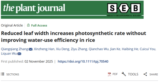 本网讯 近日,我院武立权教授团队在植物学领域知名期刊《The Plant Journal》上发表题为“Reduced leaf width increases photosynthetic rate without improving water-use efficiency in rice”的研究论文。该研究系统揭示了降低叶片宽度可有效提高水稻光合作用速率,但未能同步提升其水分利用效率,为水稻高光效育种提供了重要的理论依据。