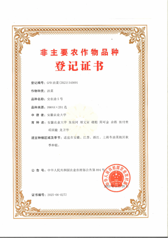 产量表现:2021-2023年国家区域试验平均亩产206.37千克,比对照增产5.09%,平均亩产油98.11千克,比对照增产11.61%。