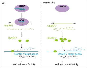 该工作不仅回答了领域内关于“单个phasiRNA是否有功能”的长期疑惑,还揭示了osphasiRNA-OsAGO2-OsARF7的水稻雄性育性调控新分子通路,拓展了人们对phasiRNA功能机制的认知,为作物遗传改良和杂交育种提供了理论依据和潜在靶点。