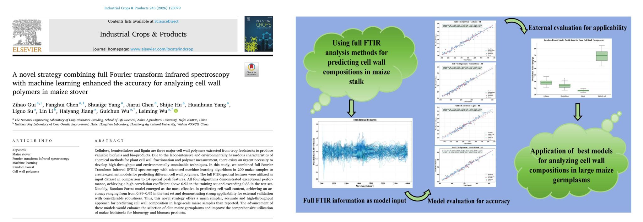 3月15日,安徽农业大学农学院/生命科学学院吴雷明教授团队在玉米秸秆细胞壁组分高通量精准分析方法方面取得新进展。相关结果以《A novel strategy combining full Fourier transform infrared spectroscopy with machine learning enhanced the accuracy for analyzing cell wall polymers in maize stover》为题发表在国际期刊《Industrial Crops and Products》(中科院一区TOP期刊,影响因子约6.2)。