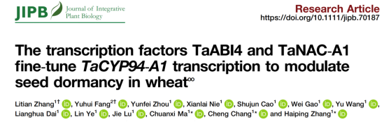 近日, 安徽农业大学农学院黄淮南部小麦生物学与遗传育种重点实验室马传喜教授团队在作物种子休眠与穗发芽抗性研究领域取得重大突破。相关研究成果以“The transcription factors TaABI4 and TaNAC-A1 fine-tune TaCYP94-A1 transcription to modulate seed dormancy in wheat”为题,于2月11日在《Journal of Integrative Plant Biology》(2026 IF=9.3)上发表。