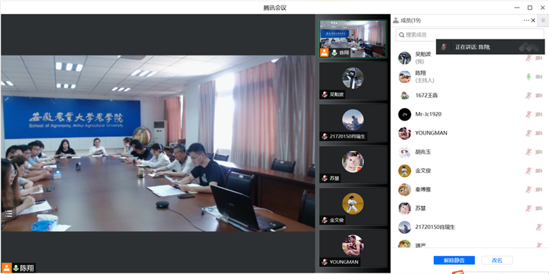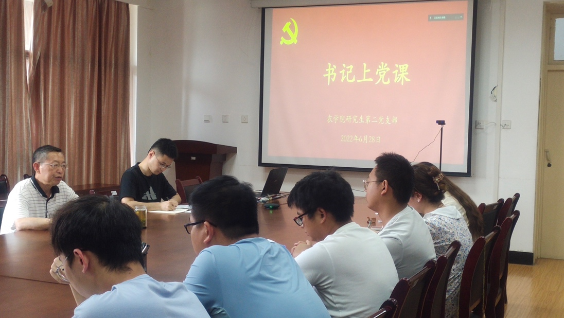 本网讯 6月28日下午,农学院研究生第二党支部在十教518开展“七一”主题党课暨优秀毕业生党员交流座谈会。会议采用线上线下同步进行,由研究生第二党支部书记陈翔主持,农学院党委书记管志权出席本次会议。