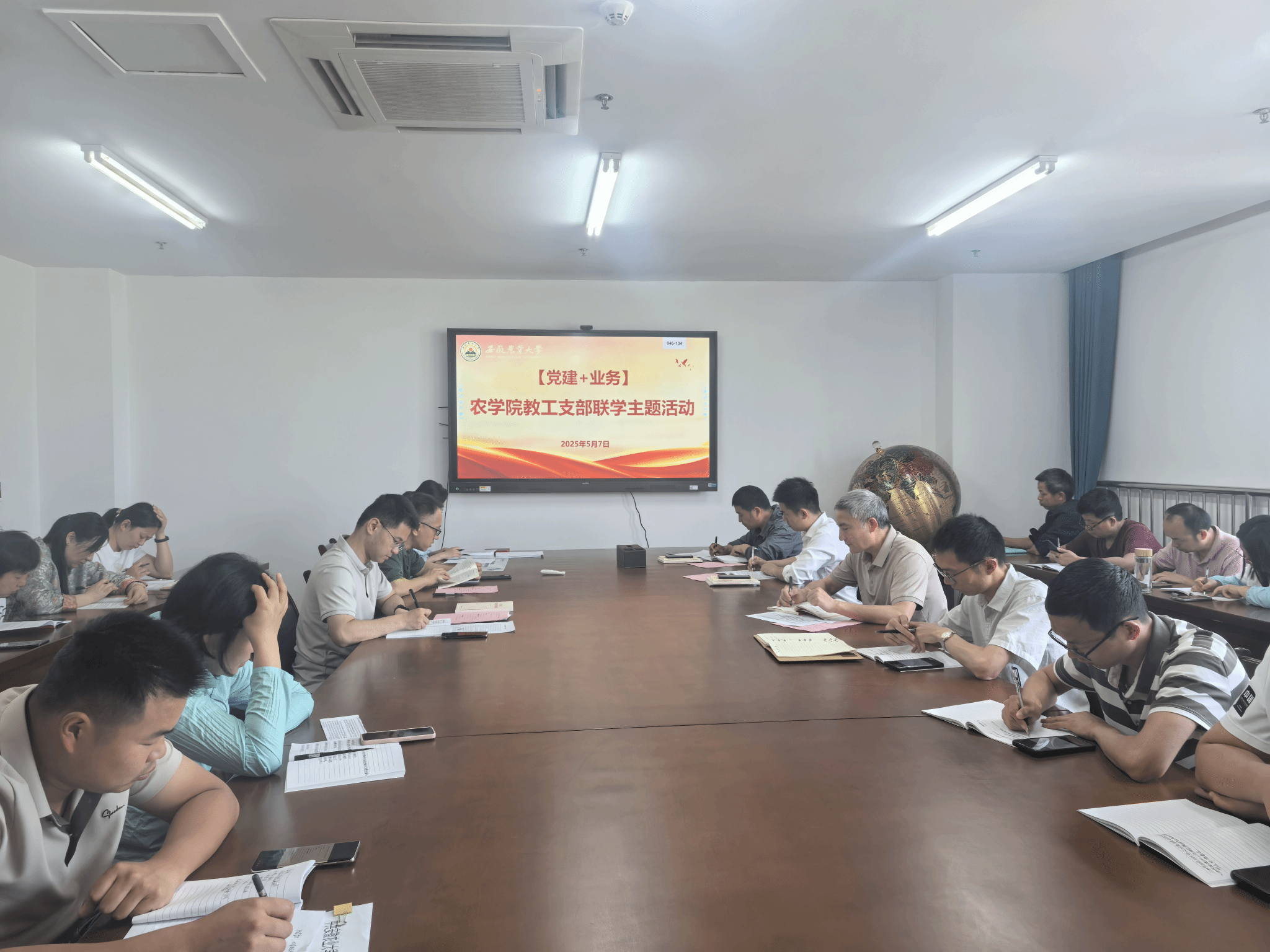 本网讯 5月7日下午,农学院教工第一和第二党支部在朝阳楼206会议室开展“党建+业务”联学主题活动,会议由支部书记黎珉和陈翔共同主持,全体支部党员参会。