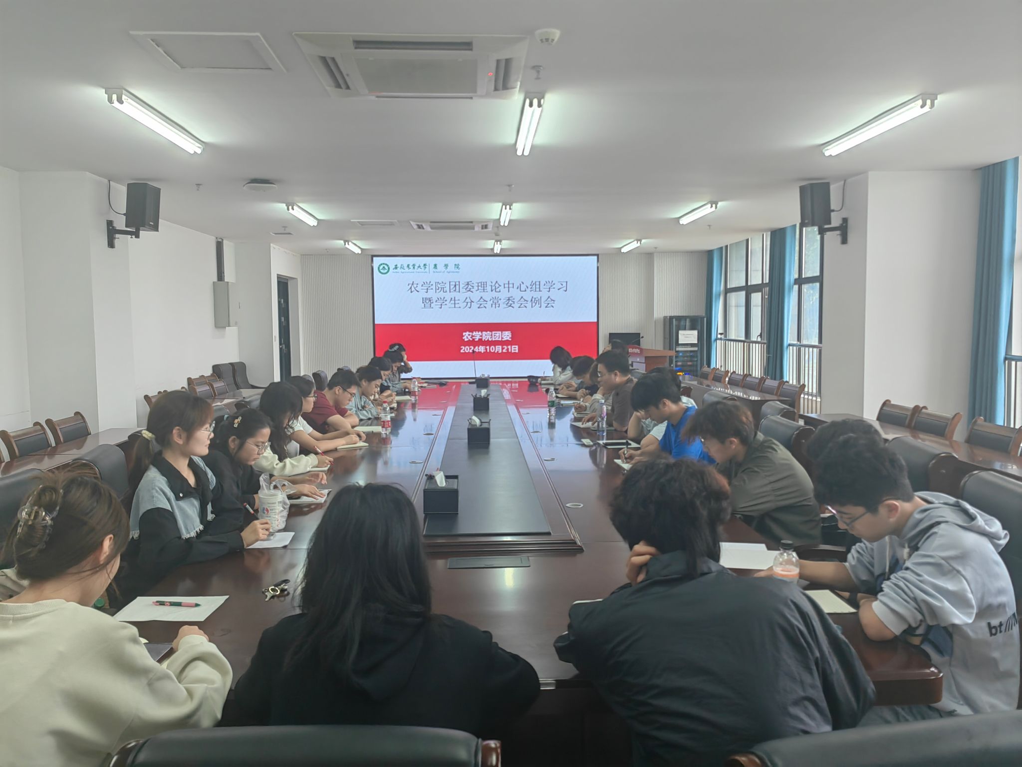 本网讯 10月21日中午,农学院在朝阳楼208会议室召开新学期学院团委理论学习中心组学习会。会议由农学院团学工作负责人范宇主持,学院团委理论学习中心组全体成员、学生会代表参加会议。
